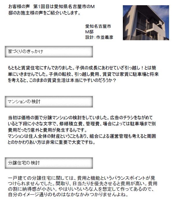 愛知県名古屋市のM邸のお施主様の声をご紹介いたします