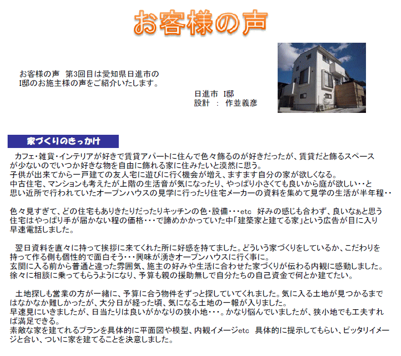 愛知県名古屋市のI邸のお施主様の声をご紹介いたします